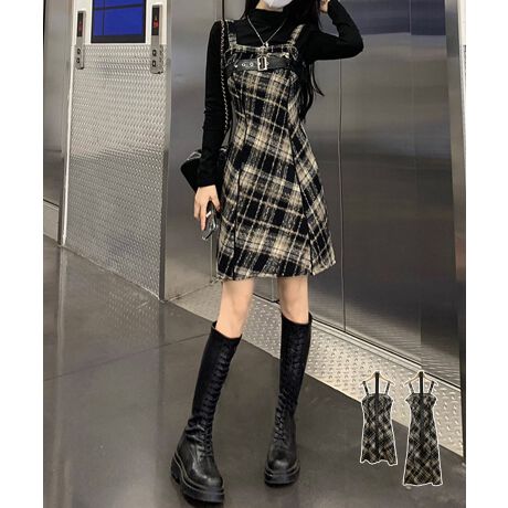 チェック柄が目を引くサスペンダーワンピースで、春秋冬レイヤードスタイルにぴったり。