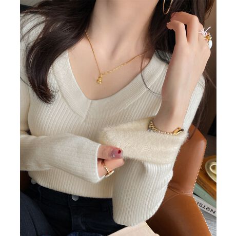 裏起毛ニットトップス Vネックリブニット