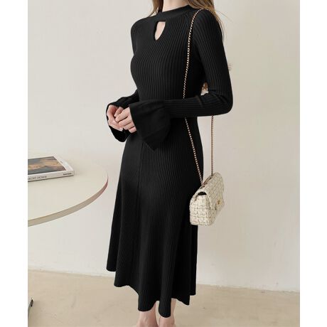 縦リブがすっきりとした印象を与える、女性らしいニットワンピース。