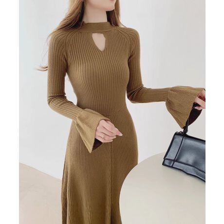 縦リブがすっきりとした印象を与える、女性らしいニットワンピース。