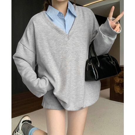 シャツをレイヤードしたようなデザインが目を引く、Vネック仕様のドッキングスウェットトップス。