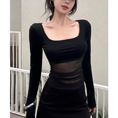 シアー生地切り替えデザインがポイントのロングスリーブトップス。