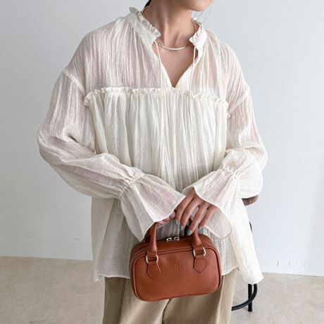 ・控えめなフリルディテールと袖のデザインが柔らかな印象に