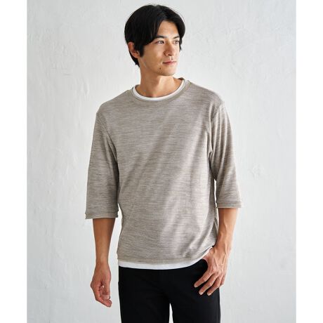 2色の糸をあまく編み立てることで綺麗な杢のニット調の生地に仕上がった6.5分袖丈のTシャツは、襟、袖口、裾がロール仕様になっています。