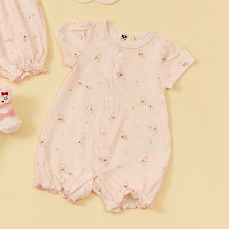 mimiちゃんの総柄を使った、パフスリーブが可愛らしいショートオール。