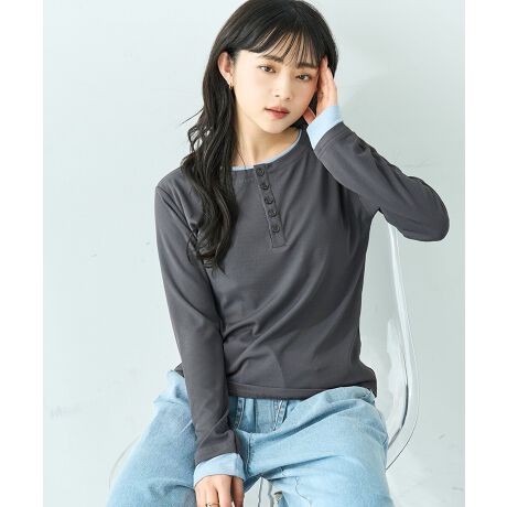 一枚でレイヤードスタイルが完成する、バイカラーデザインのヘンリーネックロンT。
