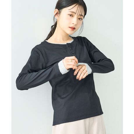 一枚でレイヤードスタイルが完成する、バイカラーデザインのヘンリーネックロンT。
