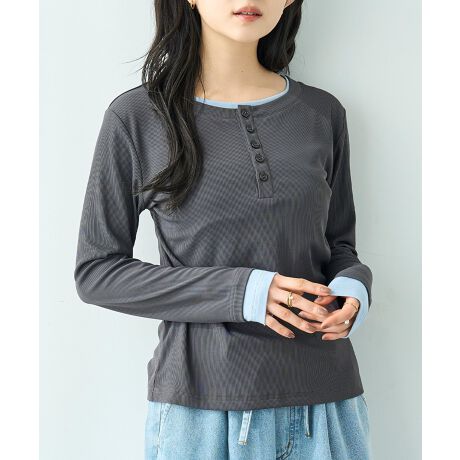 一枚でレイヤードスタイルが完成する、バイカラーデザインのヘンリーネックロンT。