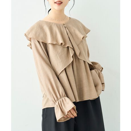 ラッフルデザインが顔まわりを華やかに見せつつ、どこか落ち着いた甘さで、大人にも取り入れやすい一着。