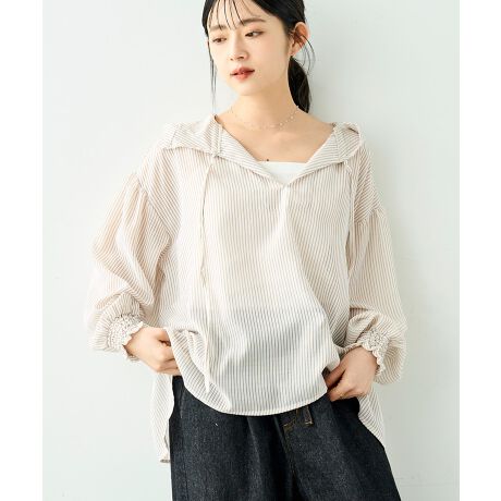ベージュストライプは、透明感のあるシアー素材。イージーケアもうれしいポイント。