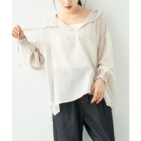ベージュストライプは、透明感のあるシアー素材。イージーケアもうれしいポイント。