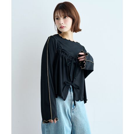 ロンTは、配色を効かせたメロウをあしらいベーシックトップスを華やかにアレンジした一枚。