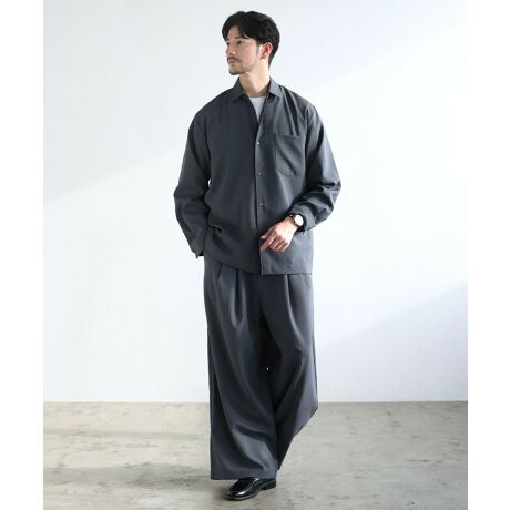 ボトムはタックを入れてシルエットにゆとりを持たせたワイドパンツです。ボリュームがありながらも、ストンと落ち感のあるシルエットで脚を綺麗に見せてくれます。ウエスト部分は後ろゴムと紐で調整可能なイージー仕様にし、脱ぎ穿きも楽々に。ベルトループとフロントファスナーも付けているのでタックインスタイルもお楽しみいただけます。見た目はかっこよく決まるのに穿き心地はラクという良いところ取りのパンツです。