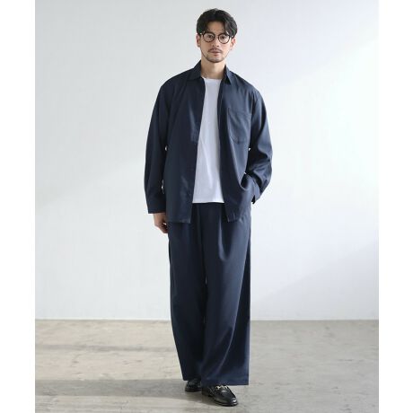ボトムはタックを入れてシルエットにゆとりを持たせたワイドパンツです。ボリュームがありながらも、ストンと落ち感のあるシルエットで脚を綺麗に見せてくれます。ウエスト部分は後ろゴムと紐で調整可能なイージー仕様にし、脱ぎ穿きも楽々に。ベルトループとフロントファスナーも付けているのでタックインスタイルもお楽しみいただけます。見た目はかっこよく決まるのに穿き心地はラクという良いところ取りのパンツです。