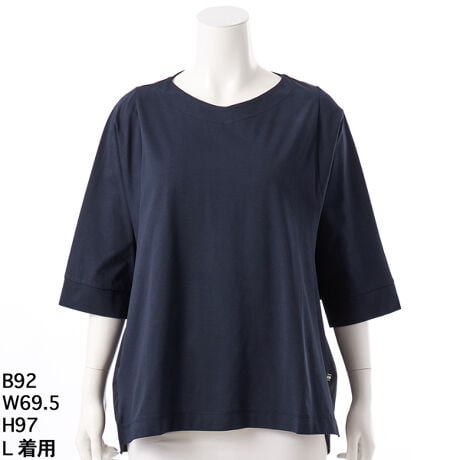 [型番:6702003]ゆったりとしたシルエットの七分袖Tシャツ。浅めのVネックが首元をスッキリと見せてくれます。後ろ身頃にTCブロードを使用。ブラウスのような仕上がりで、お仕事にも使いやすいです。TCブロードなのでシワになりにくいです。ベースの生地は接触冷感の天竺を使用しているので涼しく快適にご着用いただけます。グリーンノート 大きいサイズ レディース ゆったり 接触冷感 七分袖 涼しい Vネック