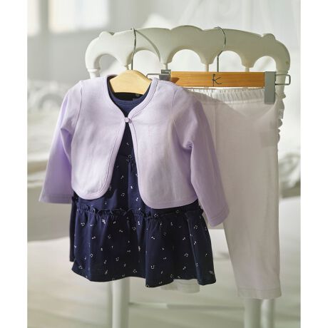 ■デザインボレロ型のカーディガン、肩にフリルをあしらったワンピース、シンプルなレギンスの3点がBOXに入ったセットアイテムです。