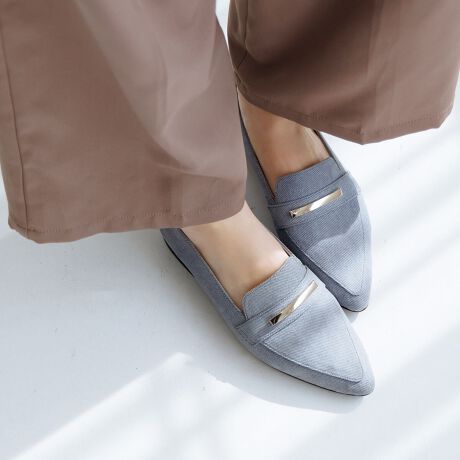 フロントのメタルバーが目を引くフラットローファー。