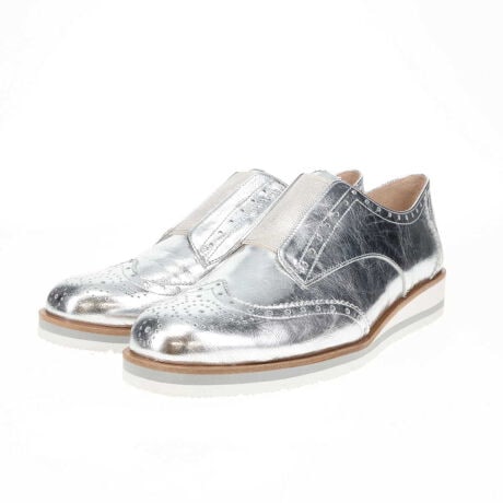 メンズ調のテーラードスタイルにぬけ感のある女性らしさを組み合わせたシューレースのない甲ゴム仕様のスリッポン。