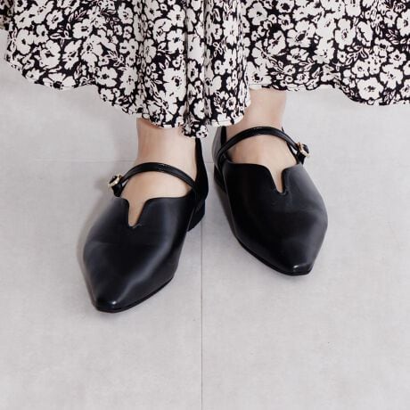フラットながら、程よく長めのトゥが脚をすっきりと見せてくれます。