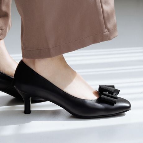 定番のリボンパンプスがよりすっきりとしたシルエットになり、足元がきれいに見えます。約5cmヒールで高さを感じさせすぎず、履きやすさにも定評があります。リピーターの多さも納得の一足です。
