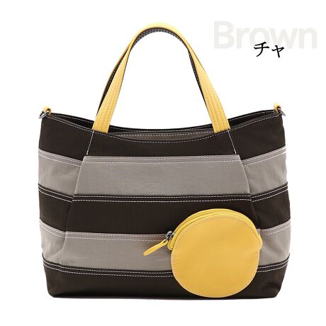・本体に軽量はっ水加工ナイロン、付属に合皮を使ったカラーコンビのボーダーが可愛い人気の手提げバッグです。