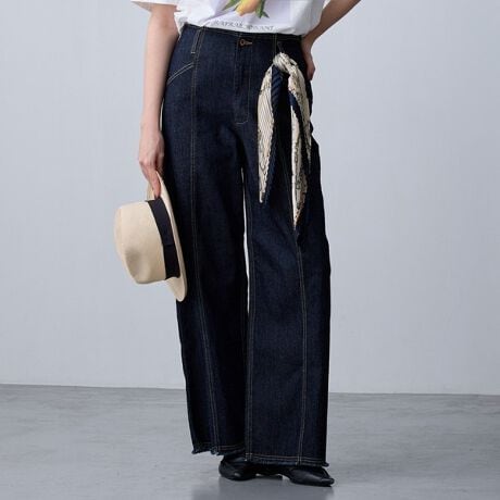 ベルトレスのハイウエストデザインとセンターラインのステッチワークがIラインを強調し、脚長効果抜群◎