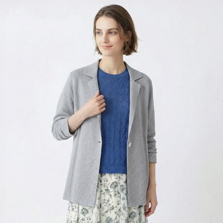 風通し良く着られる綿混ニット素材のジャケット。ゆとりのあるシルエットやワンボタンで、気負わずラフに着こなせます。脇に切り替えが入っており、ボディラインをスマートに演出できるのも心憎いポイント。