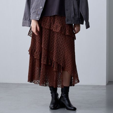 アシンメトリーなヘムデザインがレースの重なりを際立たせ、立体感のあるスカート。