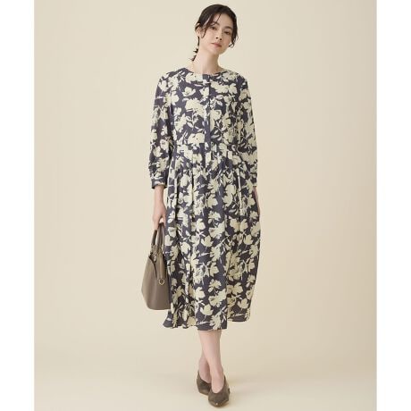 動きに合わせてしなやかに揺れるフレアラインの花柄ワンピース■デザインしなやかなデシン素材にバイカラーの花柄をプリントした、デザイン性の高いバンドカラーシャツワンピースです。ウエスト部分にはプリーツのようなタックを施し、裾に向かってなだらかに広がる印象的なシルエットに仕上げています。美しい生地の落ち感により着ぶくれせず、動くたびにタックから広がるドレープが女性らしい印象を演出してくれます。■素材表面に細かく繊細なシボ感を表現したデシン素材です。上品な光沢と美しいドレープ性、なめらかで柔らかい肌触りが特徴。プリントには大胆な花柄を施し、ところどころにテクスチャー感のあるタッチを加えることで、柄に深みと立体感を持たせています。