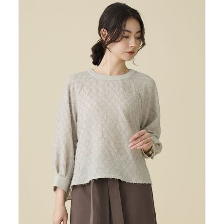 立体感が際立つ表情豊かなジャカードブラウス■デザインデザイン性のあるカットジャカードで仕立てたプルオーバーブラウスです。ラグランスリーブでお袖周りにほどよいリラックス感を持たせ、身幅も広めに設定することで、Tブラウスのようなニュアンスのある雰囲気に仕上げています。襟ぐりの切替と袖口のカフスには別布を使用し、上品なアクセントをプラスしました。お袖は手首が見える8分袖なのですっきりとした印象です。襟元にジュエリーを合わせればフォーマルなシーンにもお使い頂けます。同素材のスカート(SKWMLS0206)とセットアップでの着こなしもおすすめです。■素材タテ糸に太番手の糸を使用して表面に毛羽を出し、ヨコ糸にはポリエステルのスパン糸を組み合わせた、ソフトな手触りが特徴のカットジャカードです。ナチュラルなシワ加工と下地のひし形柄が重なり合うことで、表面に立体感と豊かな表情を生み出しています。ひし形部分は下地との厚みを変えることで柄を鮮やかに表現し、一部はチュールのような透け感を持たせて通気性も確保しました。また、ポリエステル100%のため水洗いが可能なイージーケア素材です。■同素材スカート(SKWMLS0206)