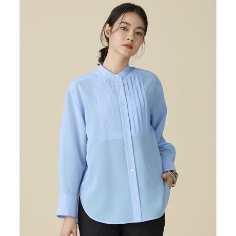シアー素材で軽やかな抜け感のある大人のブラウス■デザイン繊細な表情のシアー素材を使用したブザムブラウスです。身頃と袖には大胆な透け感のあるボイル素材を使用し、別布には透け感のない素材を配してコントラストを効かせたデザインに仕上げています。肩回りは程よくドロップさせて、前立ても太めに設定するなど、ベーシックなシャツの細部にこだわった、シンプルながら抜け感のあるデザインです。1枚での着用はもちろん、春先のまだ厚手の素材が多い時期には、レイヤードアイテムとしても新鮮なシアー感を楽しめます。■素材タテに細番手の綿糸、ヨコにポリエステルの伸縮糸を打ち込んだボイル素材になります。糸の表面をガス焼きして余分な毛羽を無くすことで、光沢感と滑らかな表面感を演出しています。また、ポリエステルの伸縮糸を使用しているため、ほどよいストレッチ感と反発感を持ち合わせています。