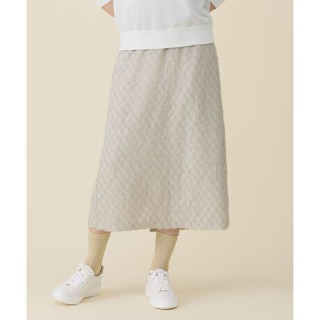 イージーケア素材の表情豊かなジャカードスカート■デザインウエストと後ろ中心のファスナーまわりに別布を使用し、同素材のカットジャカードが持つふくらみ感を生かしながらも、メリハリのある印象に仕上げたストレートシルエットのスカートです。また同素材のブラウス(BLWMLS0206)とセットで着用すると素材の表情がより引き立ち、統一感のある華やかなスタイリングをお楽しみいただけます。■素材タテ糸に太番手の糸を使用して表面に毛羽を出し、ヨコ糸にはポリエステルのスパン糸を組み合わせた、ソフトな手触りが特徴のカットジャカードです。ナチュラルなシワ加工と下地のひし形柄が重なり合うことで、表面に立体感と豊かな表情を生み出しています。ひし形部分は下地との厚みを変えることで柄を鮮やかに表現し、一部はチュールのような透け感を持たせて通気性も確保しました。また、ポリエステル100%のため水洗いが可能なイージーケア素材です。■同素材ブラウス(BLWMLS0206)