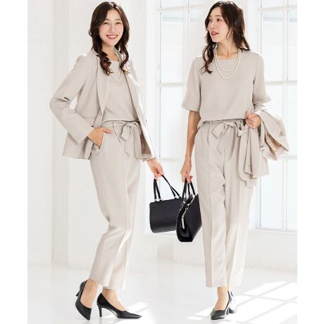 パンツは美脚が叶うテーパードデザインをご用意。ウエストの後ろがゴム入りなので、長時間ストレスなく着用いただけます。