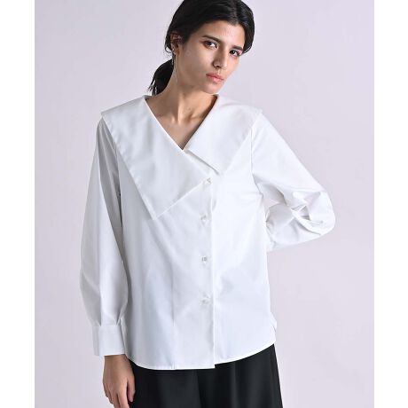 アシンメトリーに配したビッグカラーが視線を引き寄せる、存在感のあるブラウス。