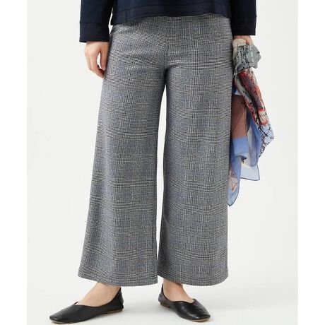 ゆったりとしたワイドストレートシルエットのフルレングスパンツです。青やオレンジの彩線が入ったグレンチェック柄がポイントで、上品な印象に仕上がります。前開きなしの総ゴムウエスト仕様で、ハイテンション素材のため動きやすく履き心地も快適です。