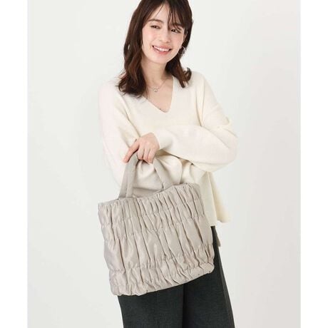 光沢のあるナイロン生地にたっぷりとギャザーを寄せた軽量トートバッグです。