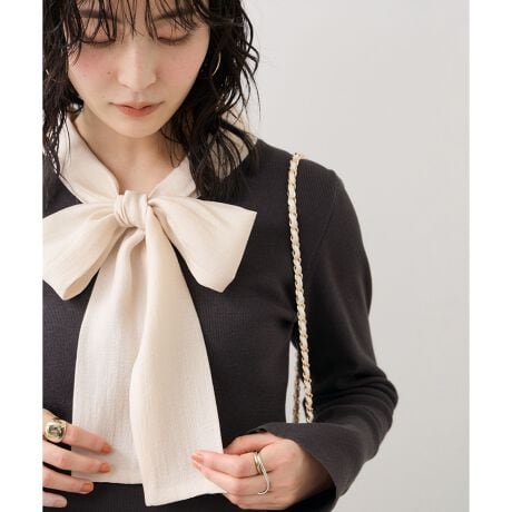・程よいハリ感のあるリボンボウタイ付きニットプルオーバー。