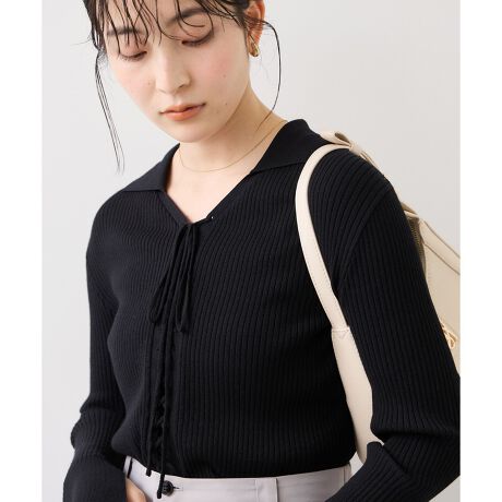 衿付きデザインなので甘さの中にクールな印象も。リブ編みですっきりシルエットです。