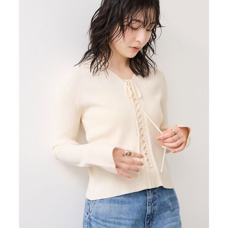 衿付きデザインなので甘さの中にクールな印象も。リブ編みですっきりシルエットです。
