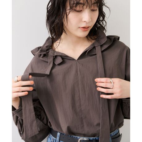 襟ぐりにフリルがついているデザイン。ボウタイは結ぶこともできますが垂らすのがおすすめになります。スキッパー開きで抜け感のあるスタイルに!!