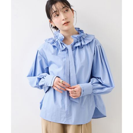 襟ぐりにフリルがついているデザイン。ボウタイは結ぶこともできますが垂らすのがおすすめになります。スキッパー開きで抜け感のあるスタイルに!!