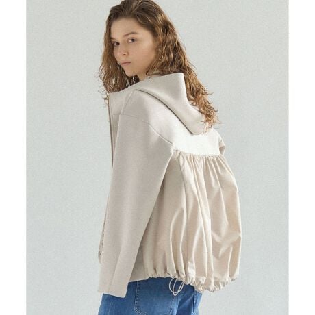後ろのヨーク下から前のパネルまで、タフタ素材で切り替えた異素材コンビのライトアウターです。裾のゴムはドロスト仕様になっているので、ヒップまわりのシルエットの変化を楽しむことができます。バルーンシルエットにすることでニュアンス感がプラスされ、全体的に軽やかな印象に。フーディーはスタンド襟に仕上げているので暖かさもあり、絶妙なシルエットで程よいカジュアル感を与える万能アウターです。 カラーは、上品で落ち着いた印象のベージュ(033)、知的で洗練されたネイビー(075)、着回し力抜群でシックなブラック(005)の3色です。