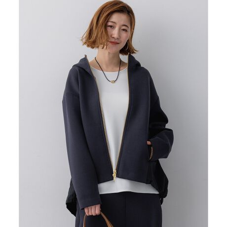 後ろのヨーク下から前のパネルまで、タフタ素材で切り替えた異素材コンビのライトアウターです。裾のゴムはドロスト仕様になっているので、ヒップまわりのシルエットの変化を楽しむことができます。バルーンシルエットにすることでニュアンス感がプラスされ、全体的に軽やかな印象に。フーディーはスタンド襟に仕上げているので暖かさもあり、絶妙なシルエットで程よいカジュアル感を与える万能アウターです。 カラーは、上品で落ち着いた印象のベージュ(033)、知的で洗練されたネイビー(075)、着回し力抜群でシックなブラック(005)の3色です。