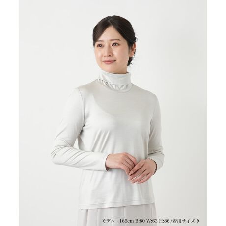 シルク混ならではの上質な光沢感と滑らかな肌触りが魅力のエレガントなハイネックカットソーです。春先に最適なやや薄手の素材感ながら、シルクをブレンドすることで肌に優しくしっとりと馴染む着心地を実現しました。首元を上品に包み込むハイネックが知的で洗練された印象をプラス。優れた伸縮性を備えており、身体のラインを美しく整えながらも、締め付け感のない快適なフィット感を叶えます。