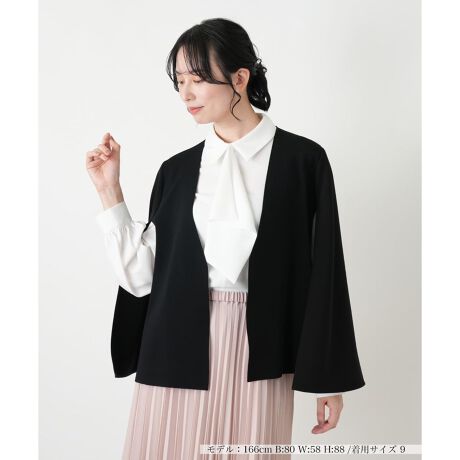 前身頃は布帛、袖部分はニットを組み合わせた異素材使いのケープジャケットです。ニット地は高い伸縮性と復元力を備えたドライな手触り。布帛部分もストレッチ性の高い素材を使用しています。フレア袖のように見えるケープデザインは、羽織るだけでエレガントで女性らしい印象に。きちんと感もあるため、フォーマルな場面でも活躍します。着崩れを防ぐため、身頃の裏側にはニットの裏地が付いています。