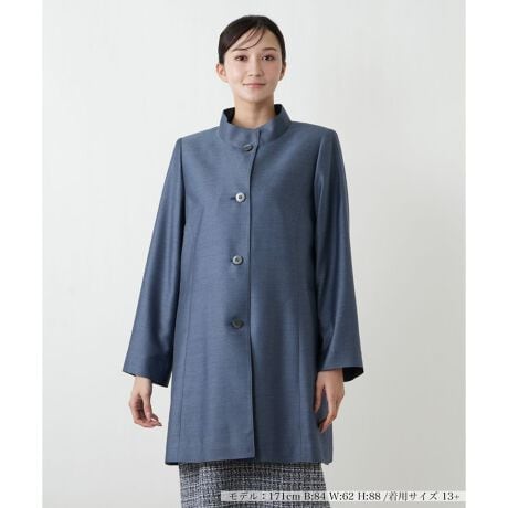 春先のセレモニーやフォーマルなシーンに最適な、洗練されたスタンドカラーコート。無駄のないシンプルなデザインが、素材の良さと美しいシルエットを引き立てます。きちんと感がありながらも、軽やかに羽織れる一着は、季節の変わり目に重宝します。ワンピースやスーツの上に重ねるだけで、装いをぐっと格上げしてくれる上品なアイテムです。