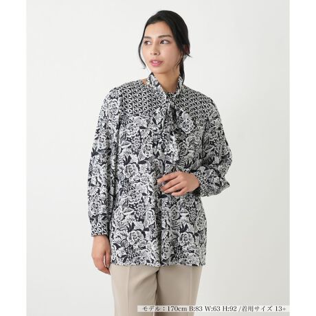幾何学模様とフラワー柄を組み合わせた、独創的なプリントが魅力のボウタイブラウスです。シワになりにくく扱いやすいデシン素材を使用し、京都の職人技で丁寧にプリントを施しました。付属のタイはリボン結びにしたり、軽く一掛けしたりとアレンジ自在。一枚で着ても、ジャケットのインナーとしても存在感を発揮する、コーディネートの主役になるアイテムです。