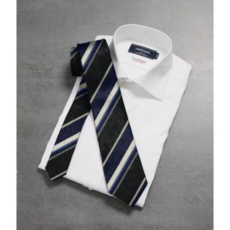 ブラックとホワイトを基調に、メリハリのある配色が目を惹くストライプ ネクタイ。ダークトーンの落ち着きのある配色が胸元を引き締め、ビジネススタイルに洗練された印象を添えます。