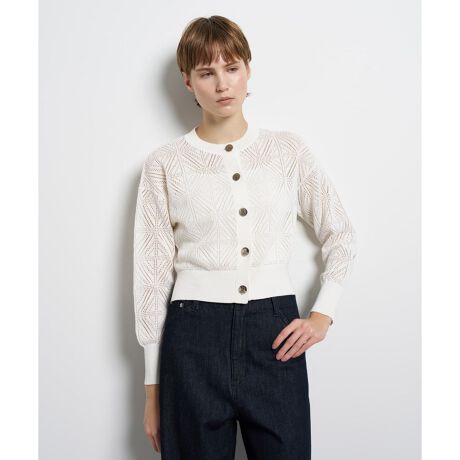 直線的な幾何学レースのような柄をニットで表現した、透かし編みのニットカーディガン。