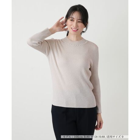 ネックラインに沿って贅沢にあしらわれたビジューが、顔周りを華やかに彩るリブニットプルオーバーです。生地には繊細なラメを織り込み、これからの季節の日差しに映える上品な光沢感をプラスしました。柔らかなリブ編みは伸縮性に優れ、身体に優しくフィットしながらも、もたつきのない快適な着心地を叶えます。やや薄手の質感はインナーとしても重宝し、日常からセレモニーまで幅広いシーンで装いを上品に格上げしてくれそうなトップスです。